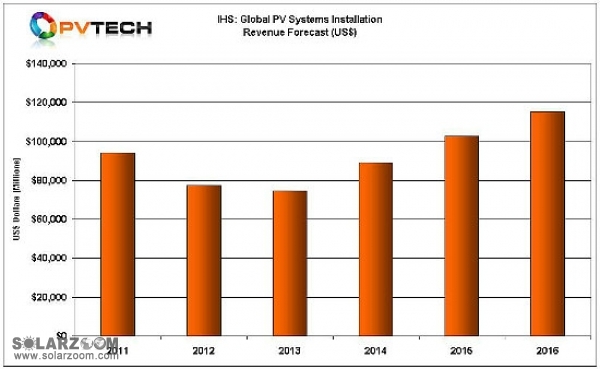 IHS預(yù)測(cè)2013年光伏系統(tǒng)安裝量將保持兩位數(shù)增長(zhǎng),據(jù)此推斷,裝機(jī)容量應(yīng)在35GW左右。