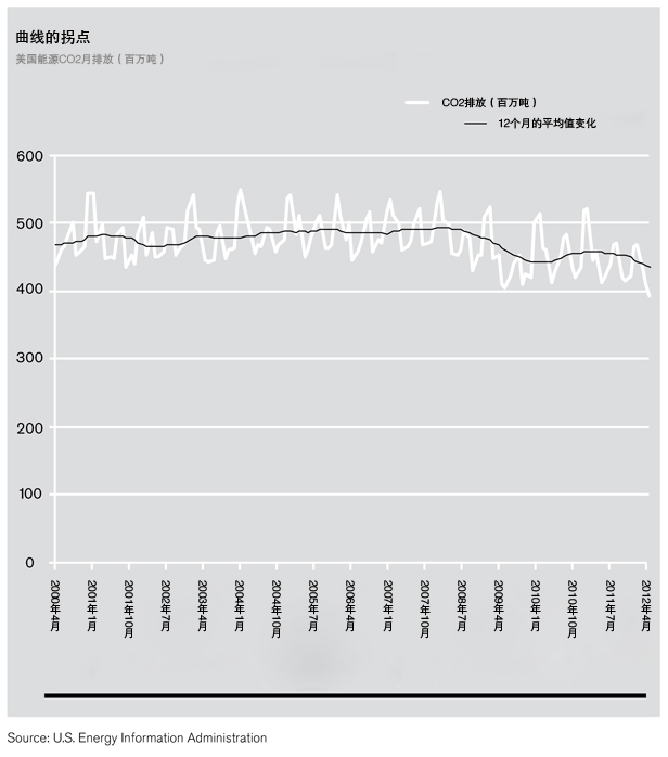 在圖表中,一年間的波動反映了用電量急劇上升的情形,尤其是在很冷和很熱的季節(jié)。黑線為12個月的平均值變化。由于全球經(jīng)濟(jì)萎縮,碳排放曾于2009年顯著下降,并在2010年反彈,而當(dāng)前則表現(xiàn)為逐步回落。