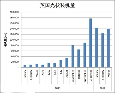 原本英國預定于今年的4月1日下調將近50%的光伏補貼幅度,后來能源與氣候變化部(DECC)將期限提前至去年的12月12日,因此在去年12月初英國的光伏裝機量達到了歷史新高的176MW,在這之后的一周,英國光伏裝機量爆跌了95%。本來搶裝應該到此就結束,但是在1月時DECC卻被法院判決提前下調補貼的做法不合法,因此雖然DECC對此結果提起了上訴,但整個市場仍然維持著積極的搶裝氣氛。到了1月底時確定DECC敗訴,英國又爆發(fā)了第二撥的搶裝潮。
