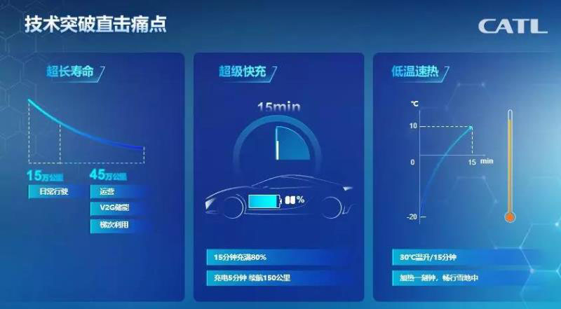 我們通過(guò)技術(shù)突破解決了一些重要的痛點(diǎn):首先,電池使用壽命能做到60萬(wàn)公里;第二,充電時(shí)間縮短到15分鐘充滿80%,充電5分鐘續(xù)航150公里;第三,低溫速熱。冬天零下二三十度的時(shí)候,一般電動(dòng)車的續(xù)航只有夏天的60%,剩下40%的電放不出來(lái)。我們發(fā)明一個(gè)技術(shù)叫低溫速熱,運(yùn)用電池本身低溫沒(méi)放出來(lái)的能量自我加熱,大概用7%左右的能量可以把電池從-20度加熱到+20度。加熱后,冬天的續(xù)航比夏天差7%-10%左右,而且費(fèi)用不會(huì)增加。