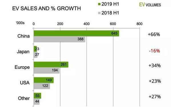 2019年上半年和2018年上半年主要國家和地區(qū)電動汽車銷量和增速