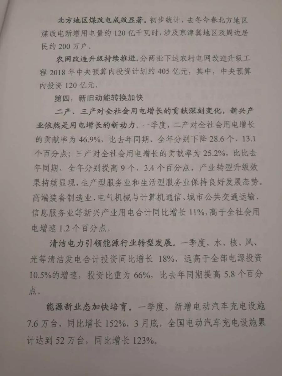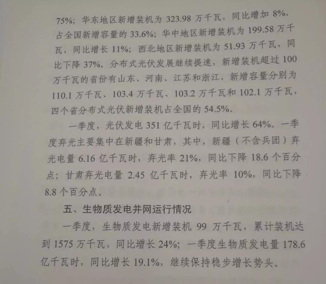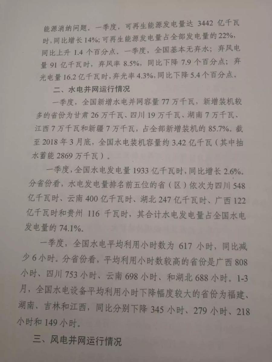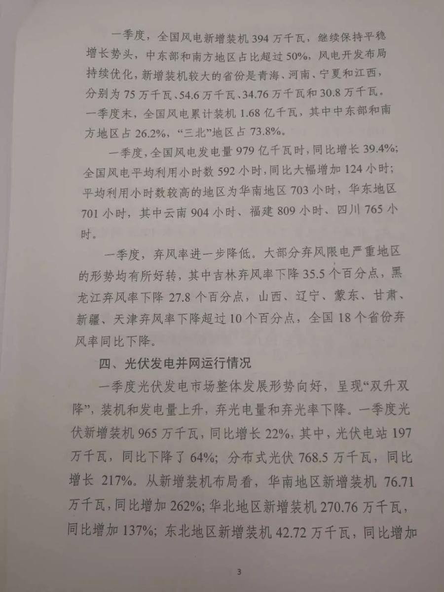 可再生能源利用水平顯著提高。一季度,可再生能源發(fā)電量達(dá)3442億千瓦時,同比增長14%;可再生能源發(fā)電量占全部發(fā)電量的22%,同比上升1.4個百分點(diǎn)。一季度,全國基本無棄水;棄風(fēng)電量91億千瓦時,棄風(fēng)率8.5%,同比下降7.9個百分點(diǎn);棄光電量162億千瓦時,棄光率4.3%,同比下降54個百分點(diǎn)。