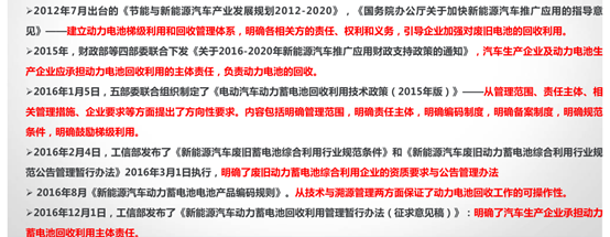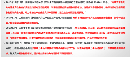 4、政策支持:實(shí)際上從2012年開始國(guó)家相關(guān)部門就密集出臺(tái)了大量與電池回收相關(guān)的政策、意見(jiàn)。例如:五部委聯(lián)合組織制定了《電動(dòng)汽車動(dòng)力蓄電池回收利用技術(shù)政策(2015年版)》、上海回收一個(gè)電池包提供一千塊元的補(bǔ)助等。