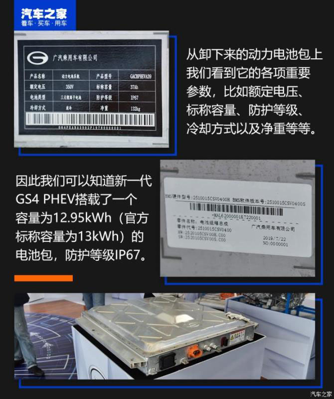 新一代GS4 PHEV采用了寧德時代供應的三元鋰離子電池,電池包(Pack)外殼采用鋁合金材質(zhì),既能做到輕量化又有利于保護環(huán)境,電池包內(nèi)部包含8個模組(Module),每個模組由12個電芯(Cell)組成,電池能量密度達到165Wh/kg。除此之外,我們還能看到模組旁邊的“電池控制單元”和“DPU電池高壓執(zhí)行單元總成”,前者負責控制電池包的輸出/輸入信號,后者負責將電池包的高壓電輸出以及輸入,至于我們看到的橙色線束,則是低壓通訊線束以及高壓匯流排。