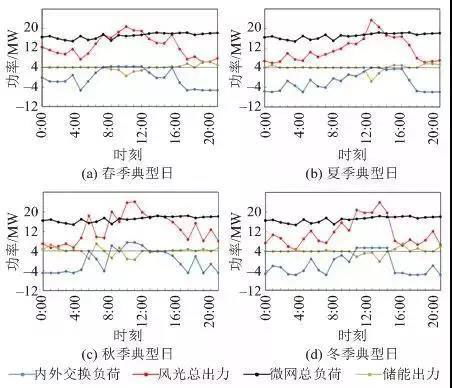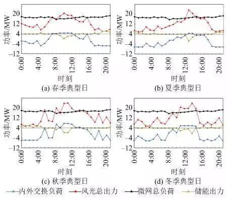 圖9和圖10為傳統(tǒng)運(yùn)營模式和一體化運(yùn)營模式下,春、夏、秋、冬四季典型日微網(wǎng)的運(yùn)行情況(儲能出力負(fù)值表示充電,內(nèi)外交換負(fù)荷負(fù)值表示外
