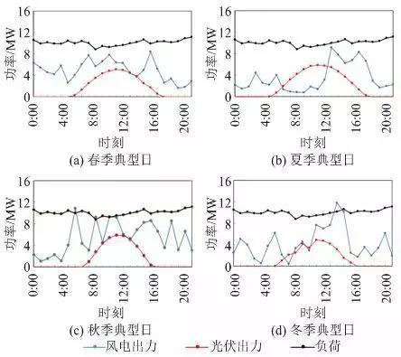 圖8四季典型日微網(wǎng)風(fēng)光出力和負(fù)荷曲線