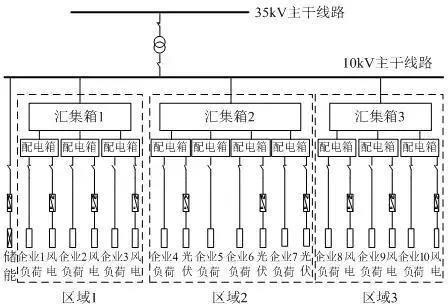 微網(wǎng)分為3塊區(qū)域,均為大工業(yè)用戶,電壓等級為10kV,最大負(fù)荷為11.13MW。項(xiàng)目壽命周期為20年,設(shè)備綜合造價及相關(guān)成本參考當(dāng)?shù)貥?biāo)準(zhǔn),基準(zhǔn)折現(xiàn)率取7%。傳統(tǒng)運(yùn)營模式下微網(wǎng)項(xiàng)目總投資約1.62億元,其中源側(cè)約14500萬元,網(wǎng)側(cè)投約310萬元,儲側(cè)約900萬元,信息化平臺(能量管理系統(tǒng))約500萬元;一體化運(yùn)營模式總投資約1.68億元,其中源網(wǎng)儲側(cè)投資變化不大,信息化平臺(大數(shù)據(jù)云計(jì)算平臺、微平衡市場交易系統(tǒng)、能量管理系統(tǒng))約1100萬元。圖7為微網(wǎng)接線方案示意圖。