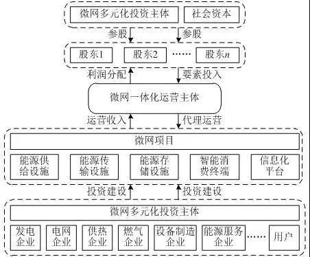 目前我國已投資建設(shè)大量微網(wǎng)項(xiàng)目,其中大部分微網(wǎng)“源-網(wǎng)-荷-儲”各環(huán)節(jié)能源設(shè)施由單一主體投資建設(shè)運(yùn)營。但是分布式能源、傳輸網(wǎng)絡(luò)、儲能等能源設(shè)施投資規(guī)模大,缺乏合理投資回報(bào)模式,微網(wǎng)項(xiàng)目主體將承擔(dān)較大投資風(fēng)險。因此,本文提出微網(wǎng)運(yùn)營一體化和投資多元化的模式框架。