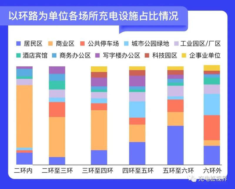 三環(huán)內(nèi)的社會(huì)公用充電設(shè)施主要集中在商業(yè)區(qū),其中在二環(huán)內(nèi)在商業(yè)區(qū)的建設(shè)占比為50%;三環(huán)至六環(huán)的社會(huì)公用充電設(shè)施,集中建設(shè)在居民區(qū)和商業(yè)區(qū),其中四環(huán)至五環(huán)有37%的充電設(shè)施建設(shè)在居民區(qū);六環(huán)外的充電設(shè)施主要建設(shè)在居民區(qū)(25%)、公共停車場(22%)和城市公園綠地(18%)。