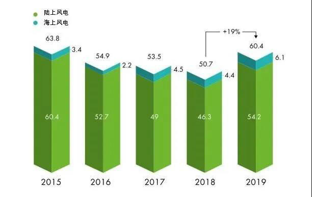 2015-2019年全球陸上風(fēng)電和海上風(fēng)電新增裝機(jī)(單位:GW)