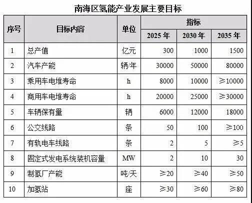 2月24日,南海出臺《佛山市南海區(qū)氫能產(chǎn)業(yè)發(fā)展規(guī)劃(2020—2035年)》,提出南海區(qū)近期(2020–2025 年)、中期(2026–2030 年)和遠(yuǎn)期(2031–2035 年)三個階段氫能產(chǎn)業(yè)產(chǎn)值、汽車產(chǎn)能、加氫站建設(shè)目標(biāo)如下: