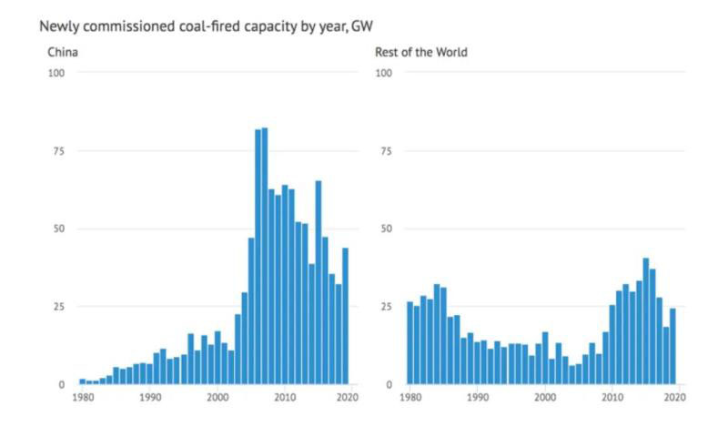 注:在1980年至2019年期間,中國(guó)(左圖)和世界其他地區(qū)(右)每年新增的燃煤發(fā)電能力(千兆瓦)。