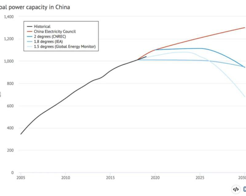 注:2005年至2030年之間,中國(guó)的燃煤發(fā)電能力(吉瓦)。歷史數(shù)據(jù)以黑色顯示。未來的場(chǎng)景以紅色(CEC)和藍(lán)色陰影顯示(1.5或2C的路徑)。