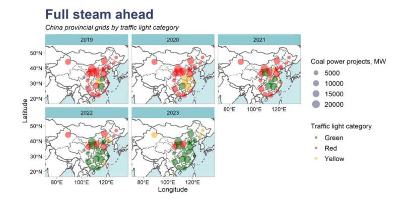 注:新燃煤發(fā)電容量的位置和大小(兆瓦,以每個(gè)圓圈的大小表示)。這些地圖是根據(jù)相關(guān)省級(jí)電網(wǎng)的“交通燈”狀態(tài)進(jìn)行顏色編碼的,紅色表示新產(chǎn)能無法獲得開工許可。