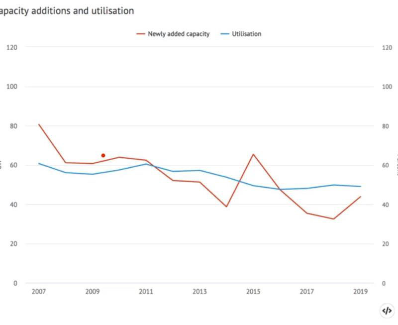 2019年,燃煤發(fā)電能力增長(zhǎng)了約40千兆瓦,增幅為4%,比過去兩年有所上升(下圖中的紅線)。結(jié)果,煤電廠的平均產(chǎn)能利用率進(jìn)一步下降,平均低于50%(藍(lán)線)。
