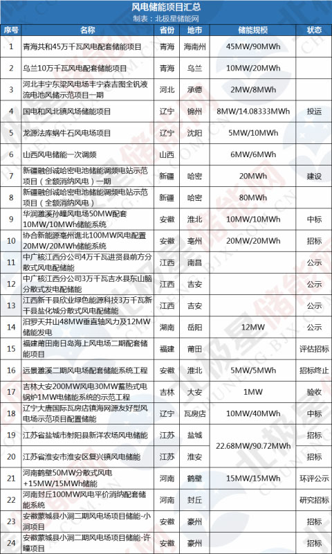 截止目前全國(guó)范圍內(nèi)風(fēng)電配套儲(chǔ)能項(xiàng)目總數(shù)量已達(dá)24例,值得注意的是,此次華能新增的項(xiàng)目都位于安徽,而近期河南也開(kāi)始出現(xiàn)風(fēng)電儲(chǔ)能項(xiàng)目,詳細(xì)見(jiàn)下表。