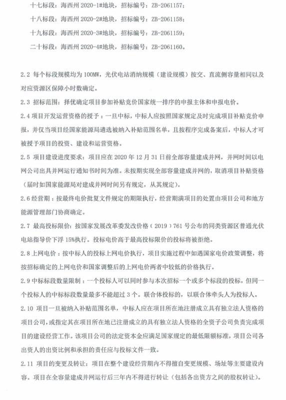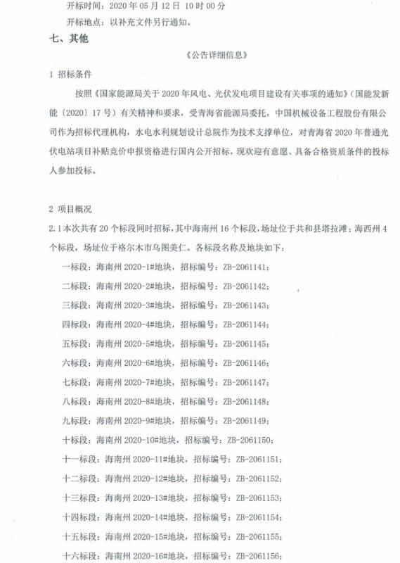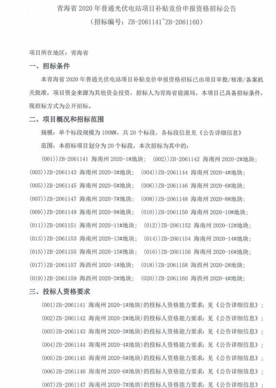 4月5日,青海能源局發(fā)布2020年普通電站項(xiàng)目補(bǔ)貼競(jìng)價(jià)申報(bào)資格招標(biāo)公告,此次招標(biāo)規(guī)模為2GW,包括20個(gè)標(biāo)段、單個(gè)標(biāo)段規(guī)模100MW,其中海南州16個(gè),海西州4個(gè)。