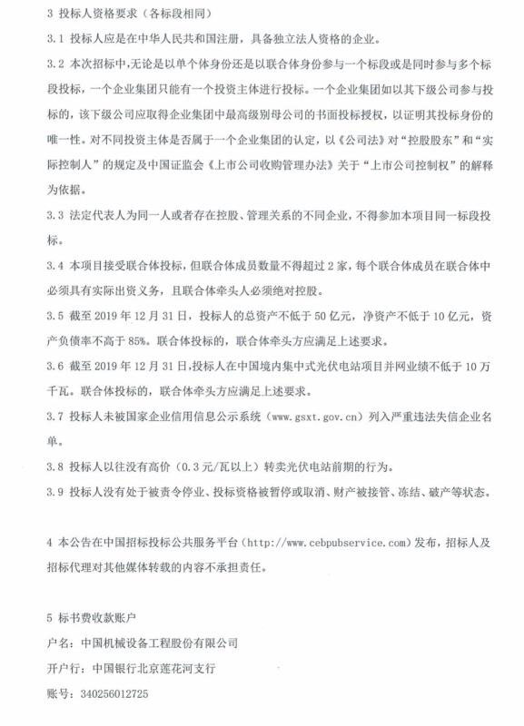 此外,競(jìng)價(jià)項(xiàng)目需于2020年12月31日之前完成全容量并網(wǎng),未按期完成并網(wǎng)的取消補(bǔ)貼資格;一個(gè)投標(biāo)人可以同時(shí)參與一個(gè)或多個(gè)標(biāo)段的投標(biāo),但同一中標(biāo)人的中標(biāo)數(shù)量不得超過3個(gè)。