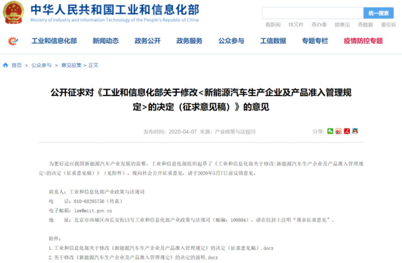 4月7日,工業(yè)和信息化部發(fā)布了關(guān)于修改《工業(yè)和信息化部關(guān)于修改<新能源汽車生產(chǎn)企業(yè)及產(chǎn)品準入管理規(guī)定>的決定(征求意見稿)》的通知。即日起,該《征求意見稿》面向社會公開征求意見,于2020年5月7日前截止。