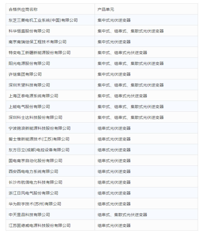 陽光電源、南京南瑞、特變電工新疆新能源、寧波錦浪、許繼集團(tuán)、科華恒盛等公司均出現(xiàn)在名錄里,詳情見下表: