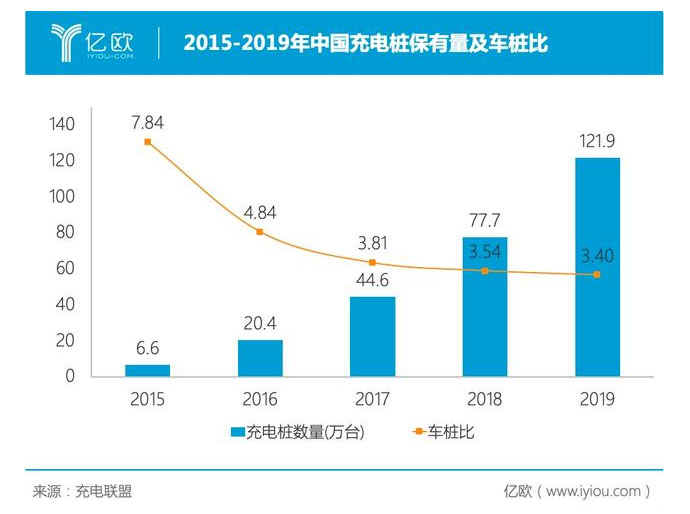 截至2015年底,我國公共類充電設(shè)施保有量僅5.7萬臺。這一數(shù)字在2019年底已達到121.9萬臺,增長了21倍。在充電樁高速建設(shè)的同時,全國車樁比水平也在持續(xù)優(yōu)化,已由2015年的7.8:1提升至2019年底的3.4:1。