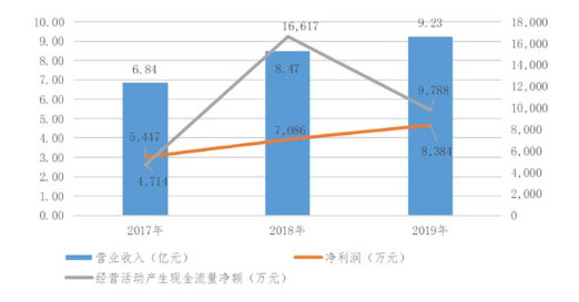 2017—2019年度(下稱報告期),上能電氣實現(xiàn)營業(yè)收入分別為6.84億元、8.47億元、9.23億元,凈利潤達到5446.65萬元、7086.04萬元、8384.29萬元,保持增長趨勢。各期經(jīng)營活動產(chǎn)生的現(xiàn)金流量凈額分別達到4713.94萬元、1.66億元、9787.65萬元,現(xiàn)金流情況良好。