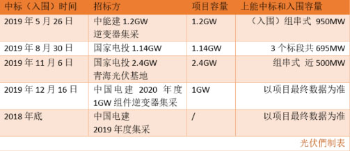 2019年更是頻頻中標央企國企的招標,入圍年度集采,總?cè)萘砍^2 GW,光伏們將上能電氣在過去一年中標/入圍的主要項目信息統(tǒng)計如下。