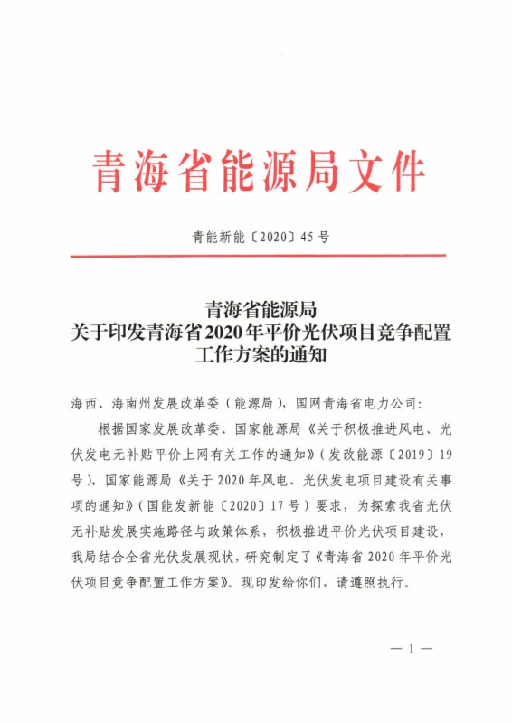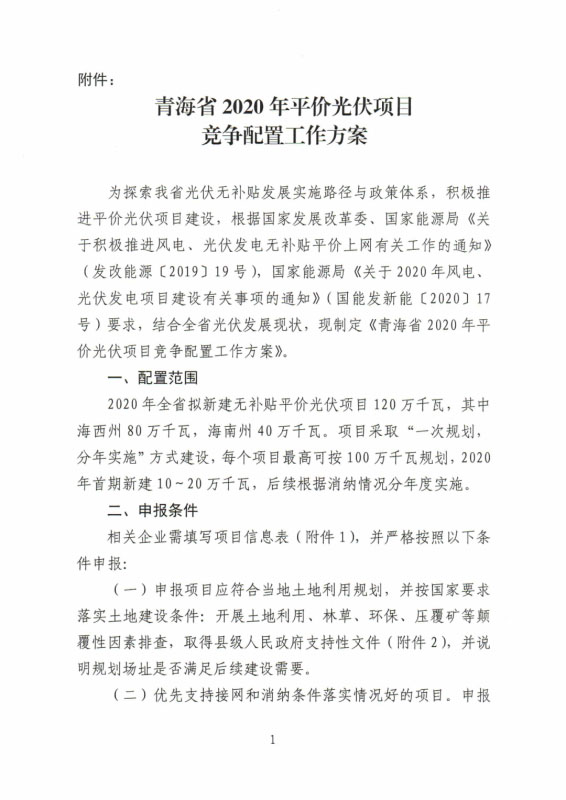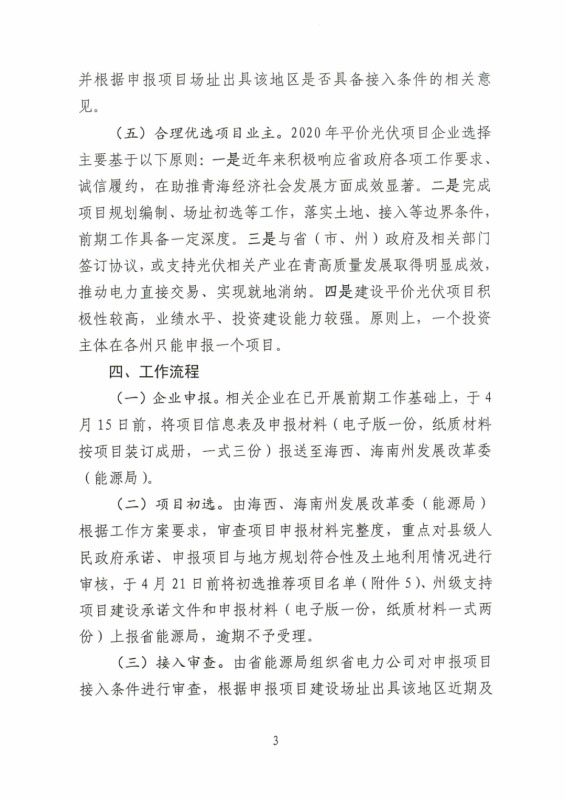 4月11日,青海能源局印發(fā)《青海省2020年平價(jià)光伏項(xiàng)目競(jìng)爭(zhēng)配置工作方案的通知》,明確全省擬新建平價(jià)項(xiàng)目120萬(wàn)千瓦,其中海西州80萬(wàn)千瓦,海南州40萬(wàn)千瓦。上報(bào)項(xiàng)目規(guī)模適當(dāng)放寬至全省2020年擬安排規(guī)模的1.5倍,原則上海西州不超過(guò)120萬(wàn)千瓦,海南州不超過(guò)60萬(wàn)千瓦。