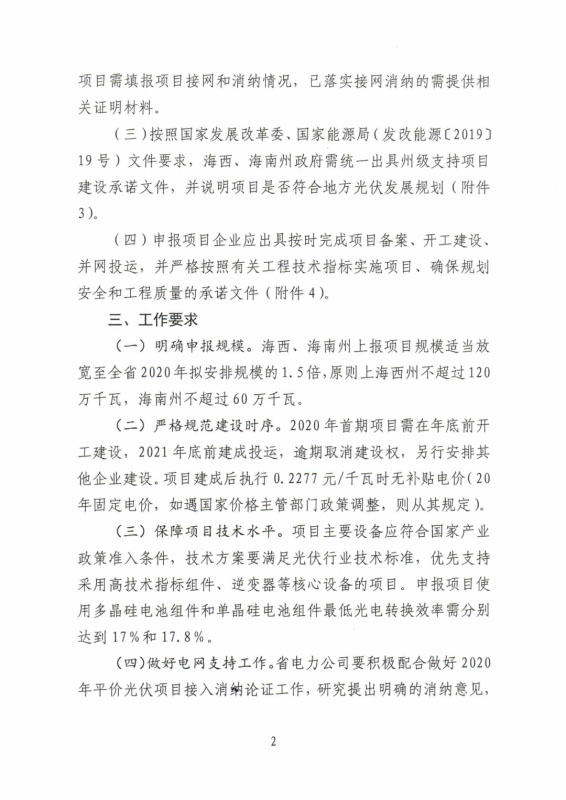 根據(jù)文件,2020年首期項(xiàng)目需在年底前開工建設(shè),2021年底前建成投運(yùn),逾期取消建設(shè)權(quán);項(xiàng)目建成后執(zhí)行0.2277元/千瓦時(shí)無(wú)補(bǔ)貼電價(jià);原則上一個(gè)投資主體在各州只能申報(bào)一個(gè)項(xiàng)目。