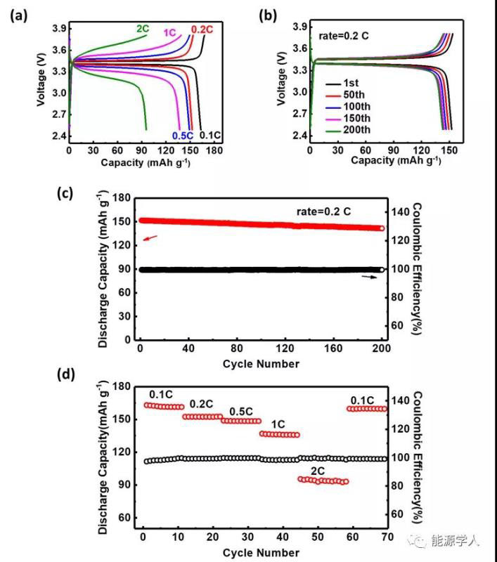 圖4展示了磷酸鐵鋰全固態(tài)電池的充放電循環(huán)性能,其中,添加了聚碳酸丙烯酯的互穿交聯(lián)網(wǎng)絡(luò)純固態(tài)聚合物作為唯一的隔膜和電解質(zhì),金屬鋰作為陽極材料,測(cè)試溫度為90℃。在低倍率 0.1 C的條件下,放電比容量可達(dá)到163 mAh/g, 在高倍率 2 C條件下,放電比容量為96 mAh/g。在充放電0.2 C條件下,經(jīng)過200次循環(huán)后,剩余放電比容量為初始值的92.7%,庫倫效率始終保持99%以上。當(dāng)充放電速率從0.1 C經(jīng)由0.2C, 0.5 C, 1 C逐漸升至2 C后,再降至0.1 C,放電比容量可以恢復(fù)到最初水平。整體來說,該電池的循環(huán)性能良好。