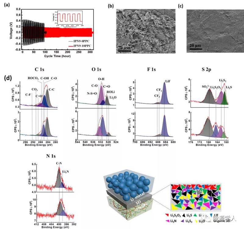 圖3.(a) 對(duì)稱鋰循環(huán)測(cè)試;循環(huán)后鋰金屬表面形貌(b)無聚碳酸丙烯酯 (c) 10 wt% 聚碳酸丙烯酯;(d)循環(huán)后鋰金屬界面XPS圖譜,上圖來自未添加聚碳酸丙烯酯的電解質(zhì),下圖來自添加10 wt%聚碳酸丙烯酯的電解質(zhì)。