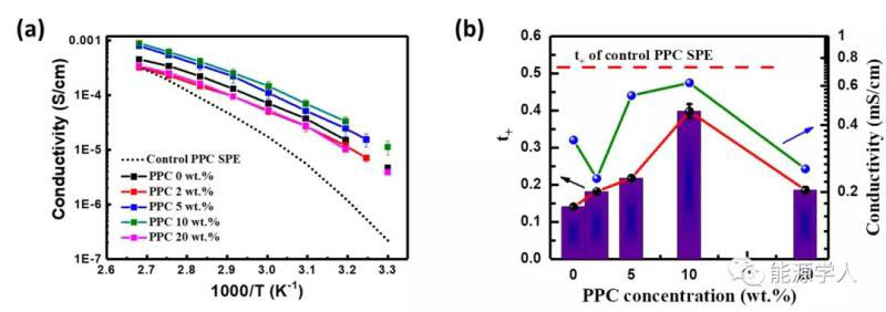 圖2 (a) 不同聚碳酸丙烯酯含量的電解質(zhì),離子電導(dǎo)率隨溫度的變化;(b)鋰離子遷移數(shù)隨聚碳酸丙烯酯含量的變化