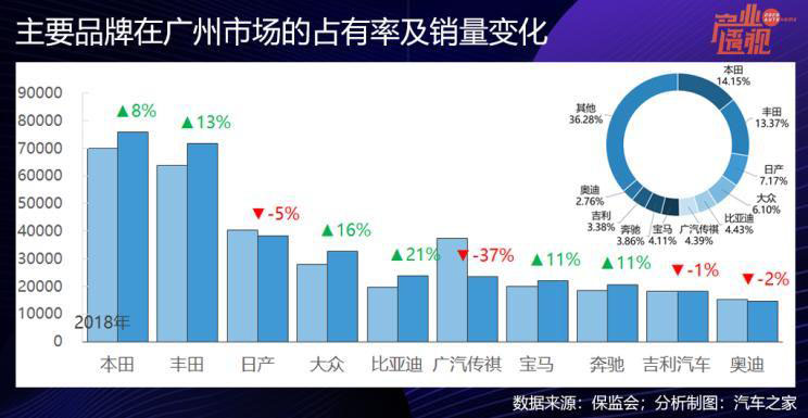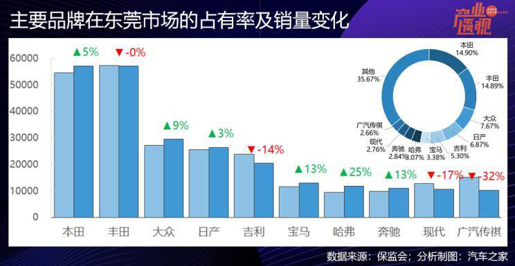 廣州和深圳是珠三角的核心城市,汽車消費相似度高,日系車在這兩個城市都占主流,豐田和本田合計占到廣州新車銷量的1/3,在深圳的合計占比也接近20%。不同的是,寶馬和奔馳在深圳的市場份額更高,都在6%以上,而廣州只有4%多一點。