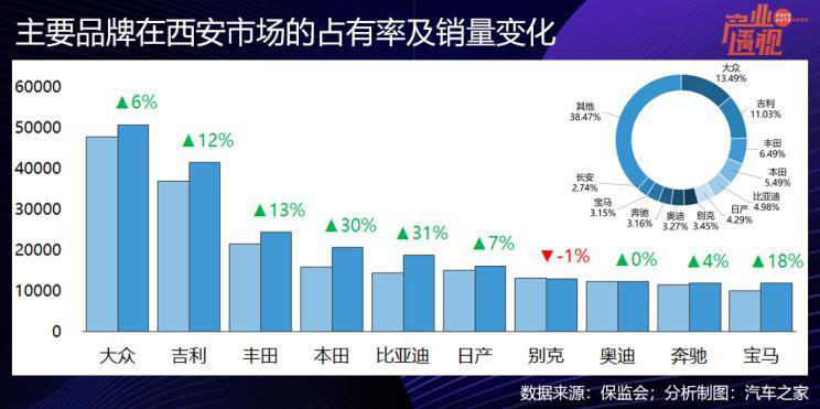 西安去年的新車銷量達37.7萬輛,微增0.03%。西安是吉利汽車最大的單一區(qū)域市場,在西安的市場占有率高達11%,僅次于大眾,高于日系品牌,且去年實現(xiàn)了12%的大幅增長,前十大銷量品牌中,去年在西安市場唯一折戟的是別克,其中昂科威和威朗的銷量下滑,但英朗和君威的銷量都增長了30%以上,別克GL8的銷量也保持穩(wěn)定。