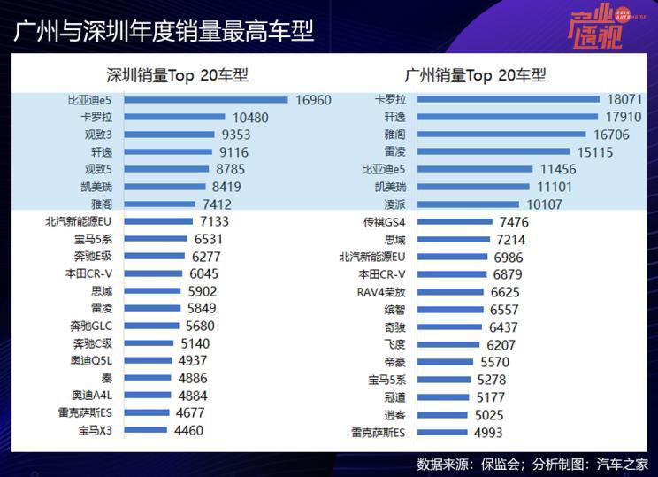 兩地熱銷車型方面,比亞迪e5作為出租車在深圳銷量第一,觀致的兩款車型進入到深圳銷量前五名。豐田卡羅拉和日產(chǎn)軒逸在廣州和深圳都是私家車熱選車型,在銷量排行榜上都很靠前。深圳市場豪華品牌車的整體銷量比廣州高,比如,寶馬2款、奔馳3款、奧迪2款進入深圳的熱銷車型Top 20榜單,而在廣州只有寶馬5系一款車進榜,且銷量沒有深圳多。另外,雷克薩斯ES都進入了兩地的熱銷車型榜,2019年,雷克薩斯銷量最高的城市就在廣州,第二大市場是上海,深圳是第三大區(qū)域市場,這三個城市的雷克薩斯銷量都超過了10000輛。