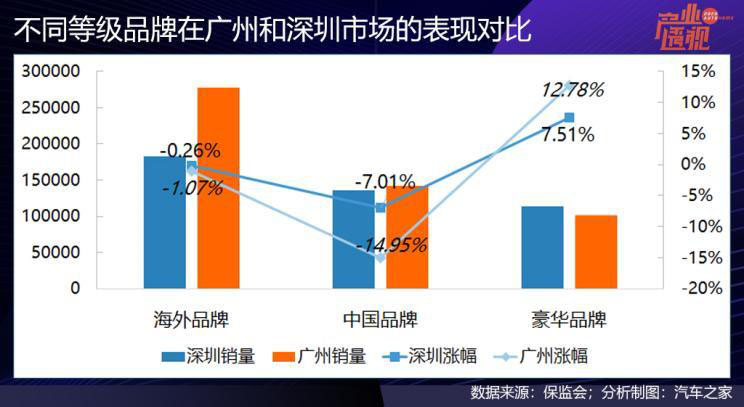 廣州和深圳2019年的GDP分別為2.4萬億元和2.7萬億元,屬于經(jīng)濟發(fā)達地區(qū),豪華品牌車去年在兩地的銷量都有高幅增長,而中國品牌則同比下滑,在廣州的下滑幅度達到15%。深圳的汽車總保有量和千人保有量都高于廣州,2019年豪華品牌絕對銷量也比廣州高。