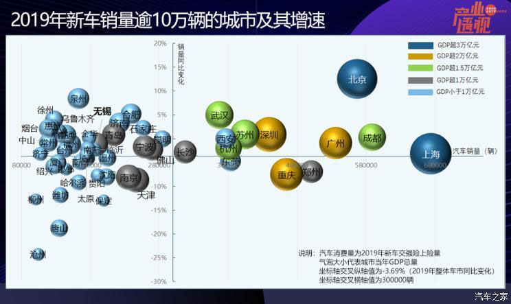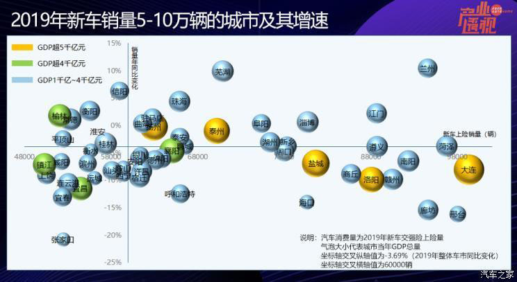 進一步放寬視野,去年銷量超過20萬輛的城市有24個,占當年全國新車總銷量的40%; 年銷量10萬輛以上的城市有53個,占同期全國的60%。這53個城市,就是國內(nèi)汽車消費的“中堅力量”,也是各大品牌的兵家必爭之地,那么這些城市未來的增長空間在哪里?從下圖可見,整體而言,GDP規(guī)模較小的城市,新車銷量也較低,甚至銷量增速也受其影響。