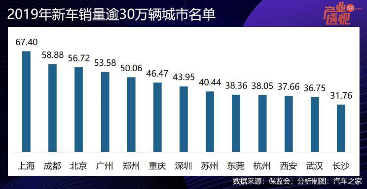 以2019年交強險上險數(shù)據(jù)看,國內(nèi)城市汽車新車年消費量超過30萬輛的城市有13個,這13個城市的汽車消費600萬輛,占全國的27.7%。這里面除東莞和西安外,其他11個城市的GDP全部到達萬億級水平,上海和北京都超過了3萬億元,上海GDP最高(38155.32億元),新車銷量也最高(67.4萬輛),也是唯一一個新車銷量過60萬輛的城市。