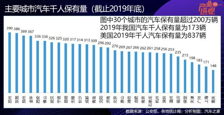 論及千人保有量(汽車保有量/常住人口),這30個汽車大城中最高的是蘇州,達到390輛,東莞與之接近,這兩個地方都是民營經(jīng)濟較為發(fā)達的地區(qū)。上海和和重慶2019年的千人保有量不到全國平均水平,北京則高達到276輛。我國國情不同,不能簡單對標美國等地的千人保有水平,這30個城市中的大多數(shù)已經(jīng)“苦擁堵久矣”,在基礎設施和交通治理水平得到根本改善之前,汽車的消費恐怕會以結(jié)構性替代為主、新增為輔。