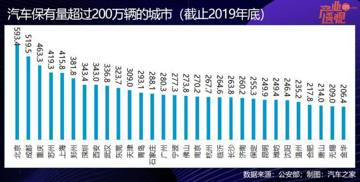 2019年,我國有66個城市的汽車保有量超過了百萬輛,30個城市超過200萬輛。其中,北京、成都、重慶、蘇州、上海、鄭州、深圳、西安、武漢、東莞、天津這11個城市的汽車保有量超過了300萬輛,北京以593.4萬輛列全國第一,成都也超過500萬輛緊隨其后。