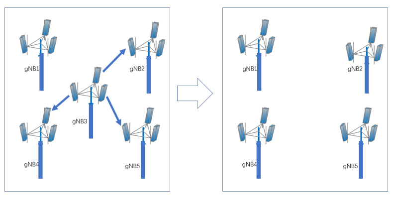 5G基站各個(gè)扇區(qū)流量遷移具體實(shí)現(xiàn)情況如圖3所示:gNB3基站的三個(gè)扇區(qū)向周邊基站實(shí)現(xiàn)流量遷移方向如箭頭所示,接收基站gNB3流量的基站gNB2、gNB4、gNB5能夠完全接收gNB3三個(gè)扇區(qū)的流量;gNB3基站完成流量遷移后開(kāi)啟休眠或者關(guān)段模式,暫時(shí)退出網(wǎng)絡(luò)運(yùn)營(yíng)。