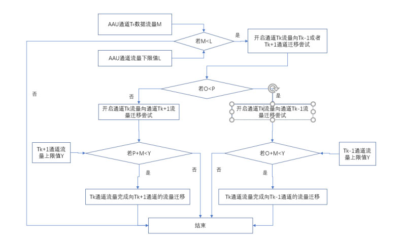 基于AAU通道完全關(guān)閉方案的流量遷移算法流程圖如圖1所示:將64通道的AAU中某個(gè)通道設(shè)為T(mén)k,Tk通道承載的流量M,Tk-1通道承載的流量O,Tk+1通道承載的流量P;設(shè)Tk通道承載流量的最低門(mén)限值是L,最高門(mén)限值是H,其中L<H,若M<L則開(kāi)啟Tk通道流量遷移嘗試;流量遷移優(yōu)先向相鄰?fù)ǖ乐谐休d流量較低的通道開(kāi)啟嘗試。