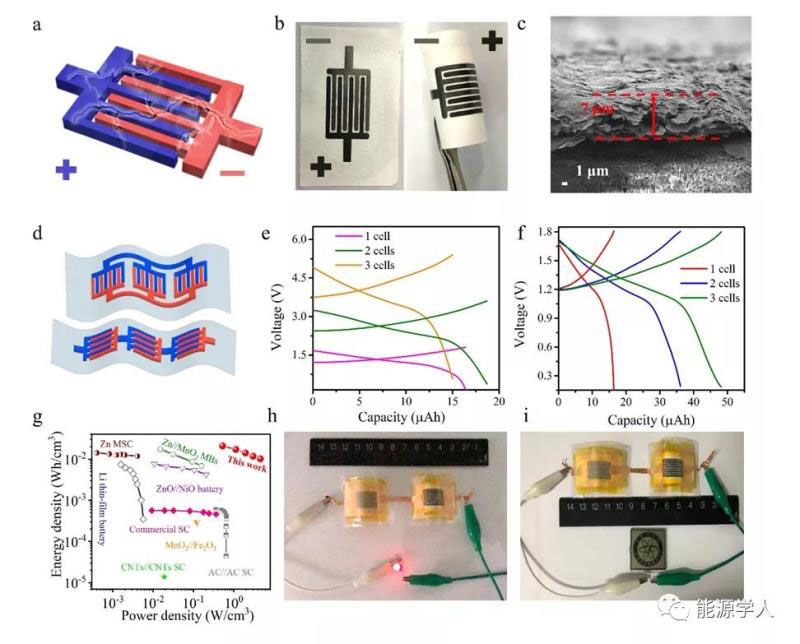 圖5. (a)平面交叉指鋅離子電池的示意圖和(b)其光學照片;(c)正極電極的橫截面SEM圖;(d)串并聯(lián)示意圖;(e)串聯(lián)和(f)并聯(lián)充放電曲線;(g)Ragone圖;(h-i) 平面交叉指鋅離子電池在彎曲狀態(tài)下點亮一個LED(h)和“DICP”標志(i)的光學照片。