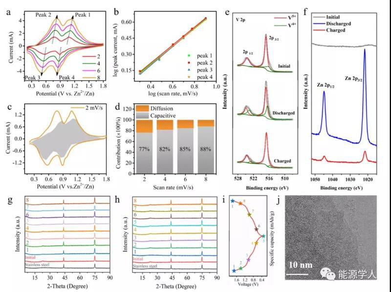 為進一步了解該鋅離子電池的高性能特點,作者進行了動力學的分析。如圖4a所示,在2-8 mV/s的掃描速率下,CV曲線表現(xiàn)出了和充放電曲線一致的氧化還原峰。據(jù)i=avb,峰1-4的b值分別為0.82,0.83,0.86和0.84(圖4b),說明其電容控制為主導的動力學行為。此外,在2mV/s時,電池容量77%來自于電容貢獻(圖4c),在4-8mV/s時,電容貢獻分別為82%-88%(圖4d)。為進一步證明鋅離子電池的工作原理,XPS(圖4e-f)和XRD(圖4g-i)揭示了其在充放電過程中的鋅離子脫出/嵌入的行為。同時,HRTEM也證明了其在充放電過程中無定形結構的特點。