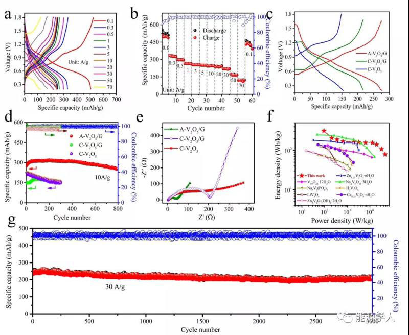 由于此二維異質(zhì)結有效耦合了高導電的石墨烯和無定形V2O5的優(yōu)點,具有構建高性能鋅離子電池的潛力。如圖3a所示,在0.1到70A/g的電流密度下,充放電曲線在1.0/0.8和0.6/0.5 V時有明顯的氧化還原峰,證實了兩電子傳輸?shù)臋C制。同時,在0.1 A/g時表現(xiàn)出超高的容量489 mAh/g,超過了目前所有報道的釩基材料。在0.1,0.3,0.5,1,3,5,10,20,30,50和70 A/g的電流密度下,該電池分別表現(xiàn)出489,330,299,266,254,250,247,237,221,175和123 mAh/g的容量(圖3b)。作為對比,無定形V2O5異質(zhì)結(A-V2O5/GZIBs),晶型V2O5異質(zhì)結(C-V2O5/G ZIBs)和無石墨烯的晶型V2O5(C-V2O5 ZIBs)也被分別應用于此鋅離子電池。圖3c所示,在10 A/g的電流密度下,A-V2O5/GZIBs具有276 mAh/g的高容量,而C-V2O5/GZIBs和C-V2O5 ZIBs只具有217 mAh/g和154 mAh/g的容量。同時,800個充放電循環(huán)后,A-V2O5/GZIBs容量保持率有93%,而C-V2O5/GZIBs和C-V2O5 ZIBs在300個循環(huán)后只有68%和97%的容量保持率(圖3d)。據(jù)Ragone圖所示,該A-V2O5/GZIBs具有優(yōu)異的功率密度46 kW/kg和能量密度313Wh/kg(基于正極材料活性物質(zhì)質(zhì)量)。同時,在30A/g下,循環(huán)3000圈后,容量保持率仍然高達87%。