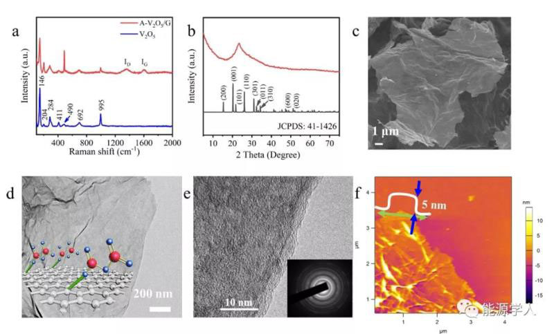 二維異質(zhì)結材料(A-V2O5/G)表征如圖2所示。Raman和XRD證明了石墨烯的存在和無定形V2O5的成功合成(圖2a-b)。圖2c-d表明了此二維異質(zhì)結材料具有超薄的納米片結構,橫向尺寸約為10μm。同時HRTEM(圖2e)和SAED再次證實了無定形二維異質(zhì)結材料的成功合成。AFM拓撲圖及其納米片對應厚度曲線展示了其平整的2D結構和均勻的厚度~ 5 nm(圖2f),與TEM和HRTEM圖一致。