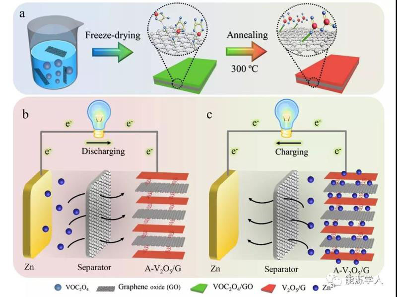 利用一種二維氧化石墨烯模板離子吸附的策略,作者可控制備出基于石墨烯和無定形V2O5的二維異質(zhì)結材料。合成方法如圖1a 所示。以VOC2O4為前驅體,利用離子吸附的方式吸附于氧化石墨烯表面,形成三明治型的前驅體。通過退火處理,得到無定形V2O5和石墨烯的超薄二維異質(zhì)結,并將其作為正極材料,構建了鋅離子電池,工作原理如圖1b,c所示。