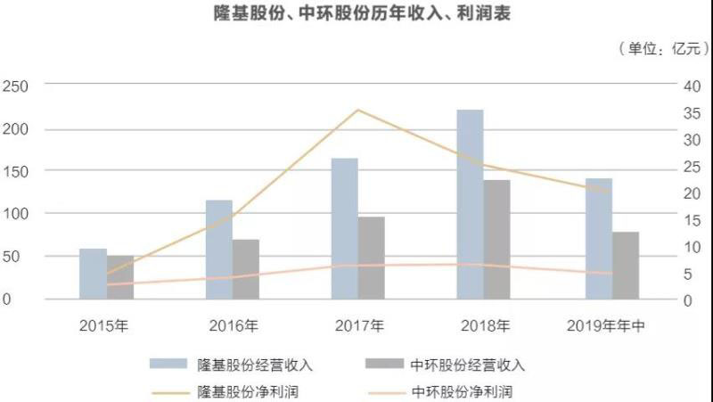 中環(huán)股份在半導(dǎo)體行業(yè)的積累更深,前身可追溯到1969年成立的天津市第三半導(dǎo)體器件廠,之后又順勢進入太陽能行業(yè),截至目前,太陽能板塊收入占中環(huán)股份9成以上。2019年,中環(huán)股份營業(yè)收入168.87億元,其中新能源材料收入149.21億元,半導(dǎo)體材料收入10.97億元。