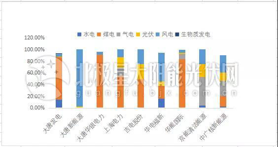 細分來看,大唐新能源以風力發(fā)電為主,占比高達97.66%;京能清潔能源以氣電為主,占比為49%;上述9家企業(yè)中吉電股份光伏發(fā)電占比最高,為25.38%。其次為京能清潔能源,占比為21.5%。排行第三的為上海電力,占比為17.34%。