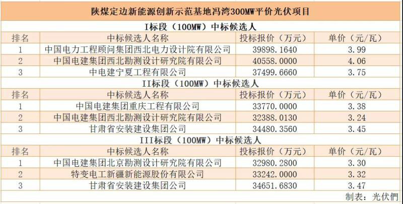 近日,長安電力(陜西)新能源科技有限公司陜煤定邊新能源創(chuàng)新示范基地馮灣300MW平價光伏項目三個標段中標結(jié)果公示。中國電力工程顧問集團西北電力設(shè)計院有限公司以39898.1640萬元的總報價中標第I標段,中國電建集團重慶工程有限公司、中國電建集團北京勘測設(shè)計研究院有限公司分別以33770.0000萬元、32980.2800萬元的總報價中標第II、III標段。